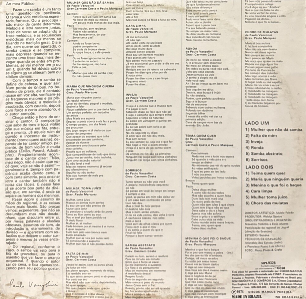 Carmen Costa e Paulo Marquez – A Música de Paulo Vanzolini (1974)