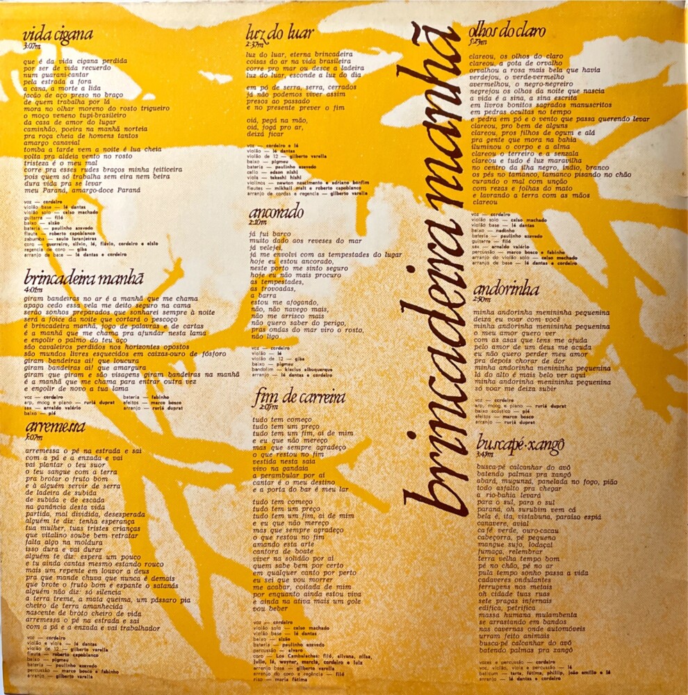 Arranjos de Ruriá Duprat (O Terço) e participação do cantor, compositor e musicista Filó Machado (Filó).