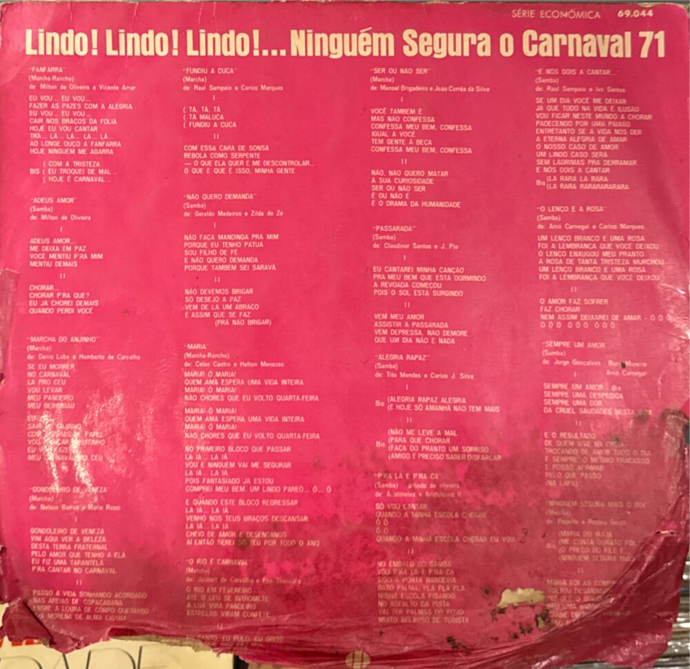 Rara compilação de inéditas (samba e frevo) para o Carnaval de 1971, lançado pela gravadora Fontana.
