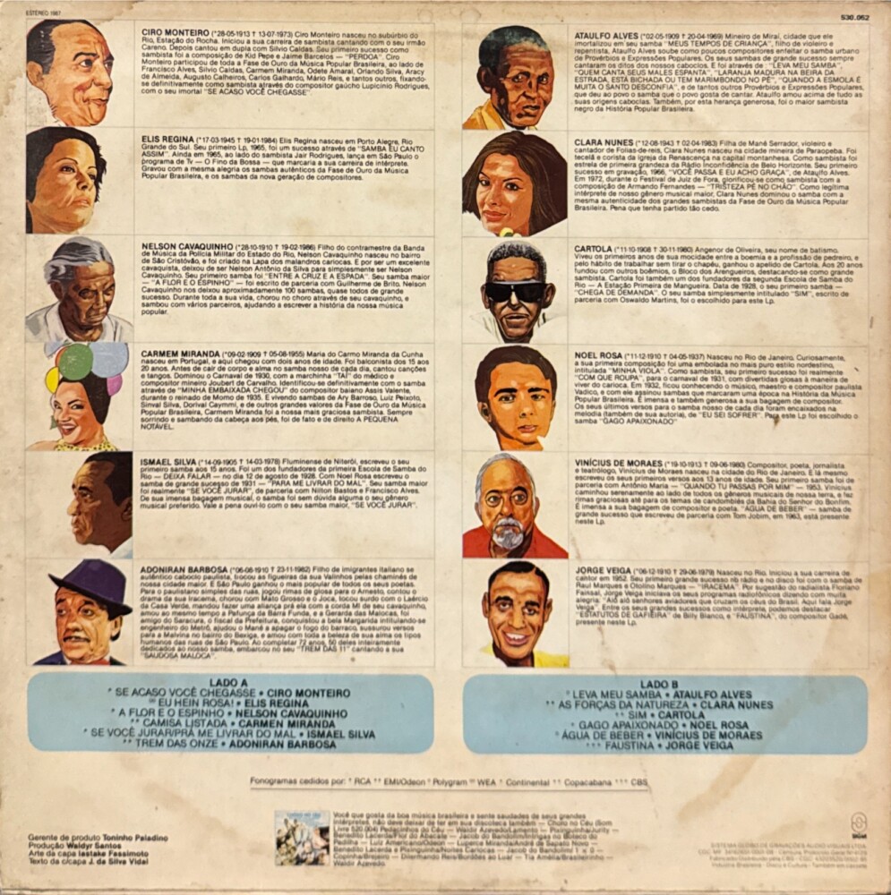 Coletânea de samba com: Cartola, Elis Regina, Nelson Cavaquinho, Adoniran Barbosa, Clara Nunes, Noel Rosa, Ataulfo Alves, Vinícius de Moraes..